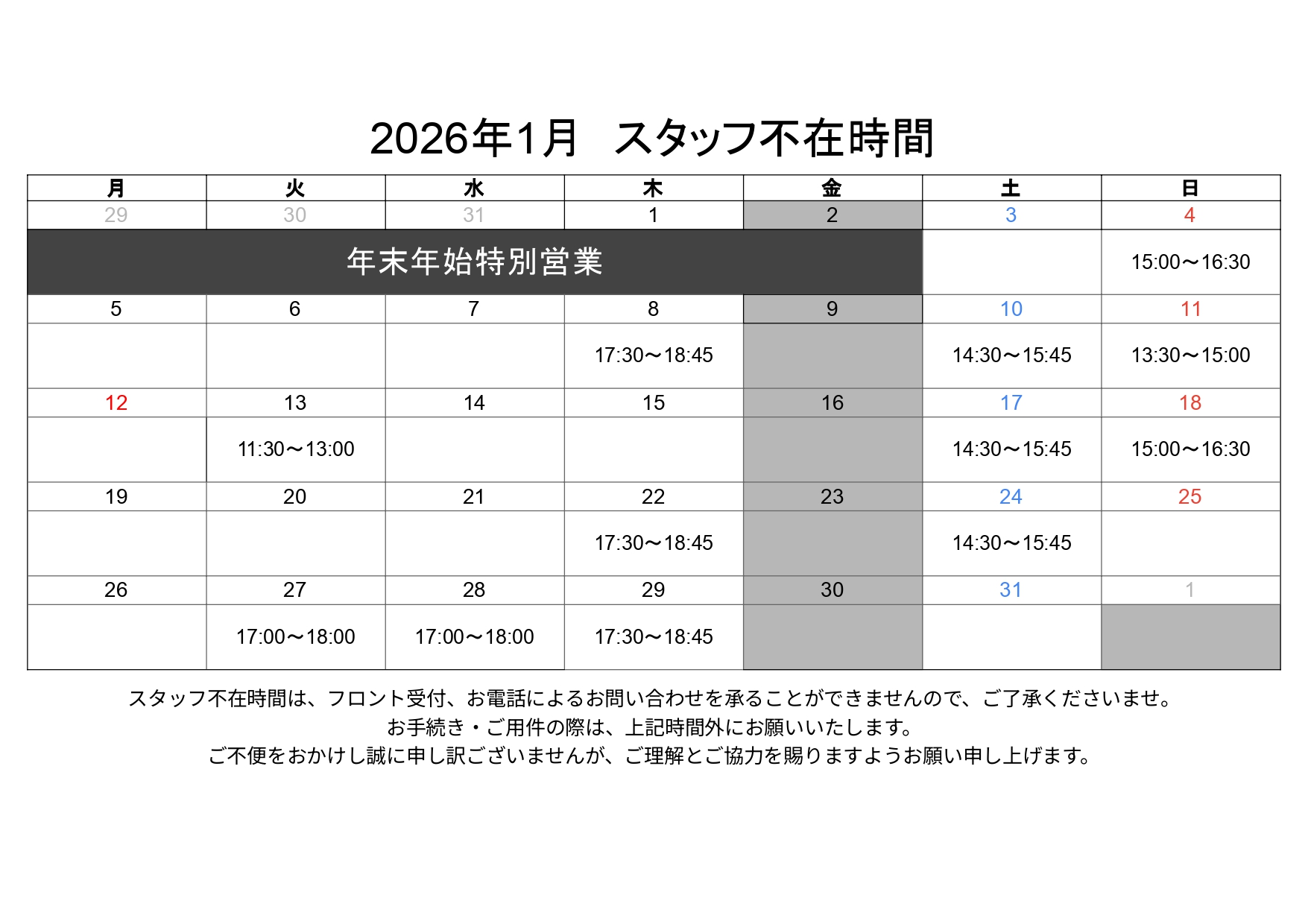 | 営業時間 | ▼営業時間 平日 9:30-22:00 土日祝 9:30-19:00 ※毎週金曜日は休館日でございます。 ▼スタッフ不在時間 来館及びお電話でのお問い合わせを 承っていない時間がございます。 スケジュールに関しては下記をご参照ください。 スタッフ不在スケジュール |