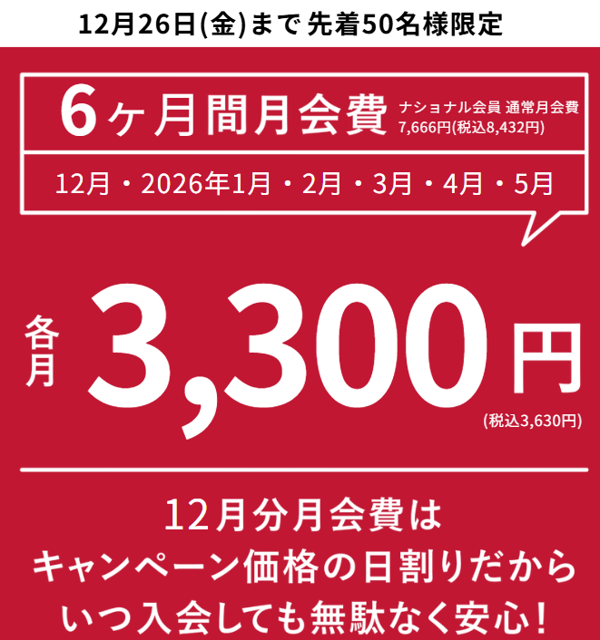・通常会費7,666円(税込8,432円)のところ2025年12月分~2026年5月分月会費各月3,300円(税込3,630円)、各種オプション2ヶ月分利用料⇒0円!!