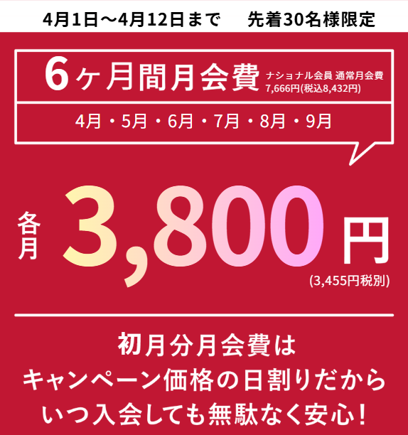 ・通常会費7,666円(税込8,432円)のところ2026年4月分~2026年9月分月会費各月3,455円(税込3,800円)、各種オプション4月、5月分利用料⇒0円!!