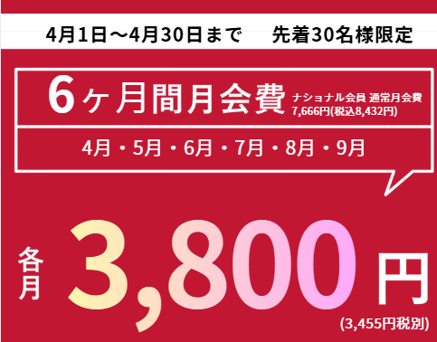 ・通常会費7,666円(税込8,432円)のところ2026年4月分~2026年9月分月会費各月3,455円(税込3,800円)、各種オプション4月、5月分利用料⇒0円!!