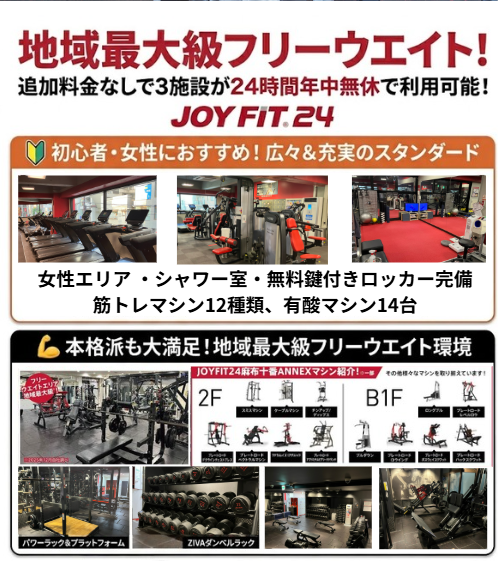 〒106-0045 東京都港区麻布十番2-10-3 マイスクエアビル2F 【JOYFIT24麻布十番アネックス】 ※ JOYFIT24麻布十番より徒歩1分! 〒106-0045 東京都港区麻布十番2-16-4 プラスワンビル地下1階 最寄り駅:東京メトロ南北線・都営大江戸線麻布十番 4番出口徒歩3分 JOYFIT24麻布十番