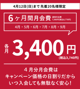破格6カ月間各月3,400円(税込3,740円)で使い放題♪
