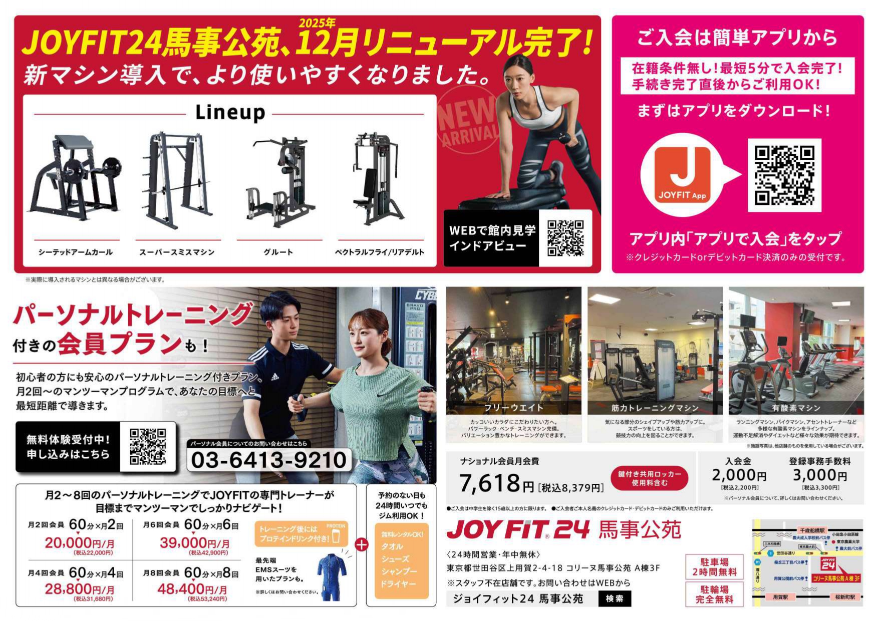 | 営業時間 | 24時間年中無休で営業しております。 スタッフ不在の無人化店舗でございます。 ご入会は、『JOYFITアプリ』から手続き可能です。 アプリのダウンロードをお願い致します。 ※クレジットカード入会専用 パーソナルトレーナー在籍店舗です。 ぜひご活用くださいませ。 |