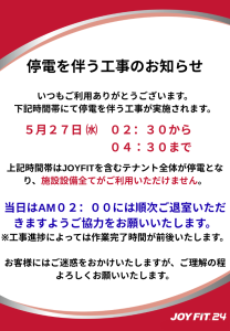 上記時間帯はJOYFITを含むテナント全体が停電となります。 施設設備全てがご利用いただけません。 当日はAM02:00には順次ご退室いただきますようご協力をお願いいたします。 ※工事進捗によっては作業完了時間が前後いたします。