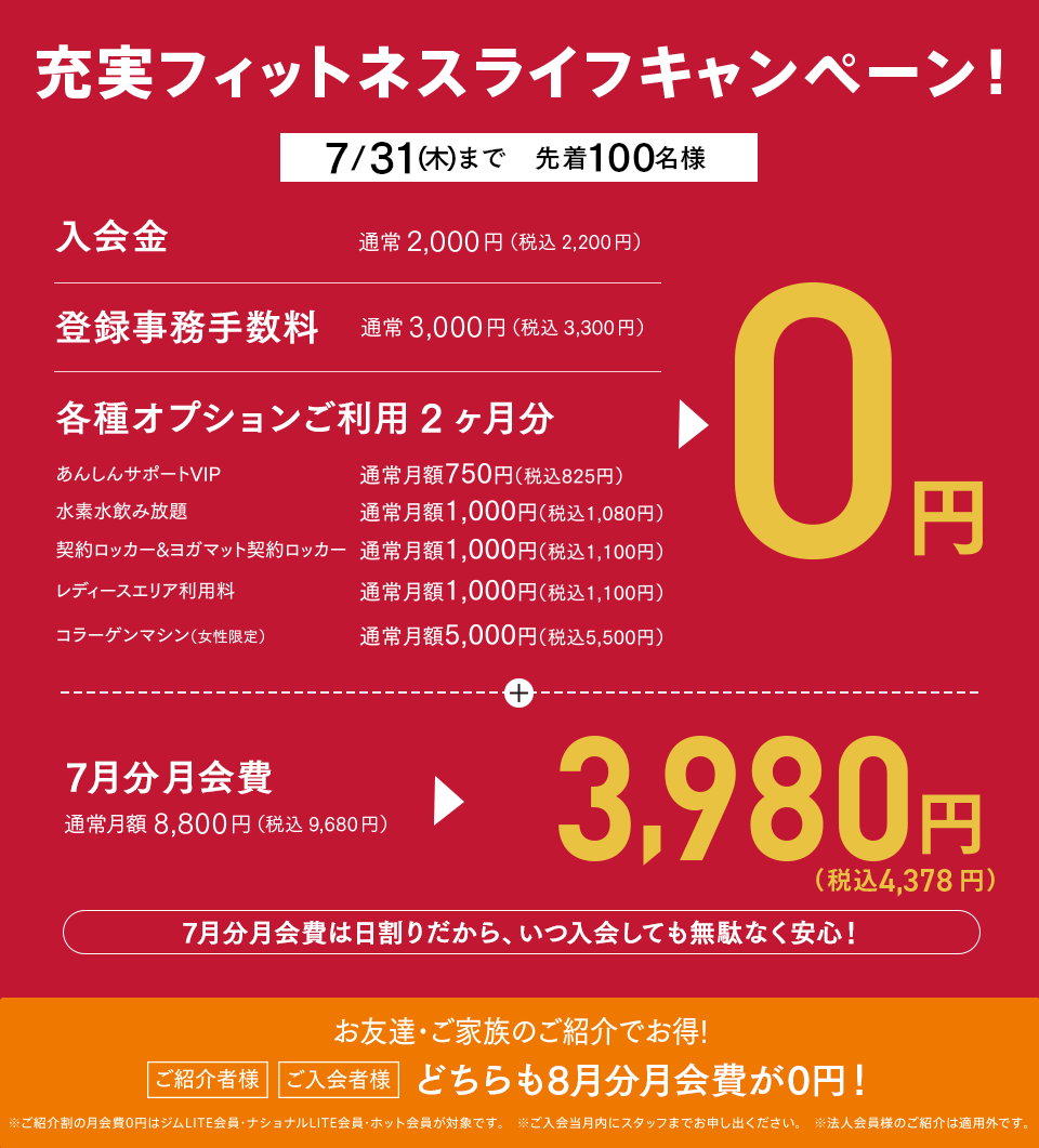 ●ご入会はJOYFITアプリまたは店頭にて承っております。 ●キャンペーン適用は、月会費の初回引落しより6ヶ月以上の在籍、あんしんサポートVIP、水素水オプション、レディースエリア(女性のみ)のご契約が必要です。 ●各種オプションは通常、オプションごとの月額利用料が施設利用の月会費とは別途かかります。 ●月会費の初回引落しより6ヶ月未満で退会の場合、解約金5,000円(税込5,500円)が発生いたします。あらかじめご了承ください。 ●12/29(月)~12/31(水)は店頭入会の受付時間に変更がございます。詳しくは当サイト下部の店舗情報をご確認ください。 ●詳しくはお問い合わせください。