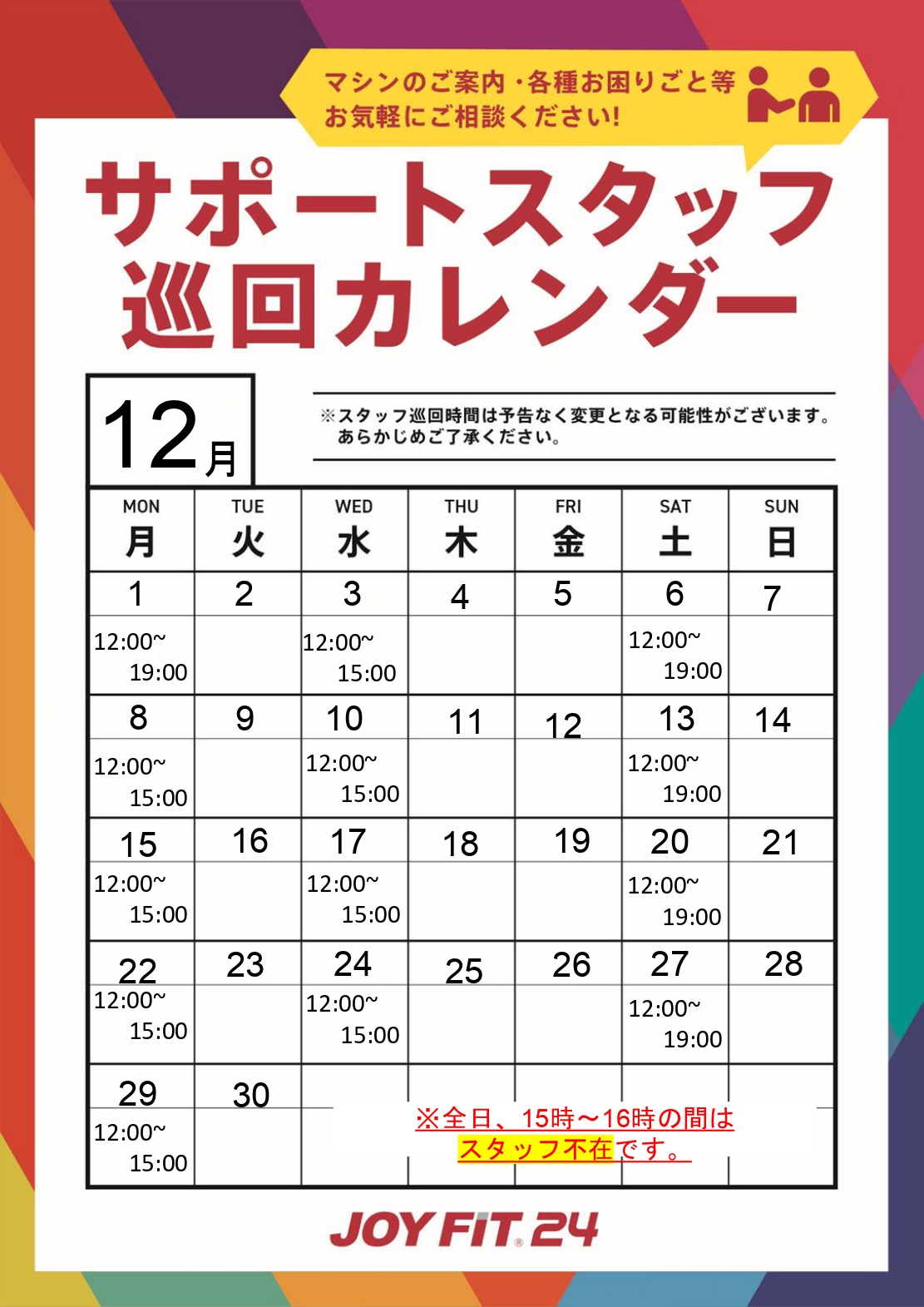 12月のスタッフ巡回カレンダーです。ご不明な点、お困りなことがございましたらお気軽にお声がけください。