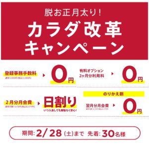 【キャンペーン】 登録事務手数料,3,300円が無料! 2月月会費が日割り! ※画像をクリックするとキャンペーン内容をご確認できます。