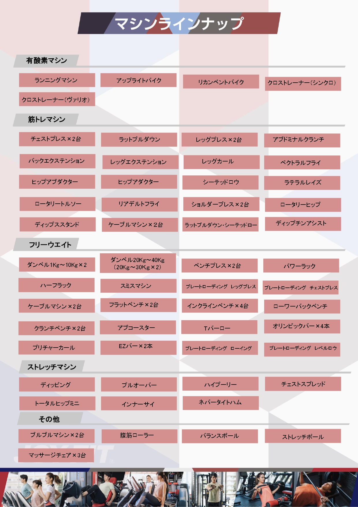 ベンチ、パワーラック、ハーフラック、スミスマシン、アジャスタブルベンチ、プレートローディング等、多くの方にご満足いただいている充実した設備。