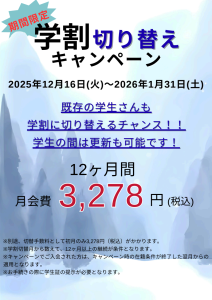 2025年12月16日から2026年1月31日までの期間で学割切り替えキャンペーンがスタートします(^^)/