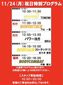 11月24日(月)祝日 通常プログラムと異なります。 お間違えの無いようお気をつけ下さい。