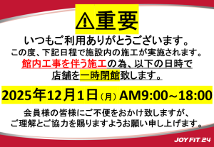 12月1日(月)AM9:00~PM18:00 上記のお時間が館内工事の為休館となります。
