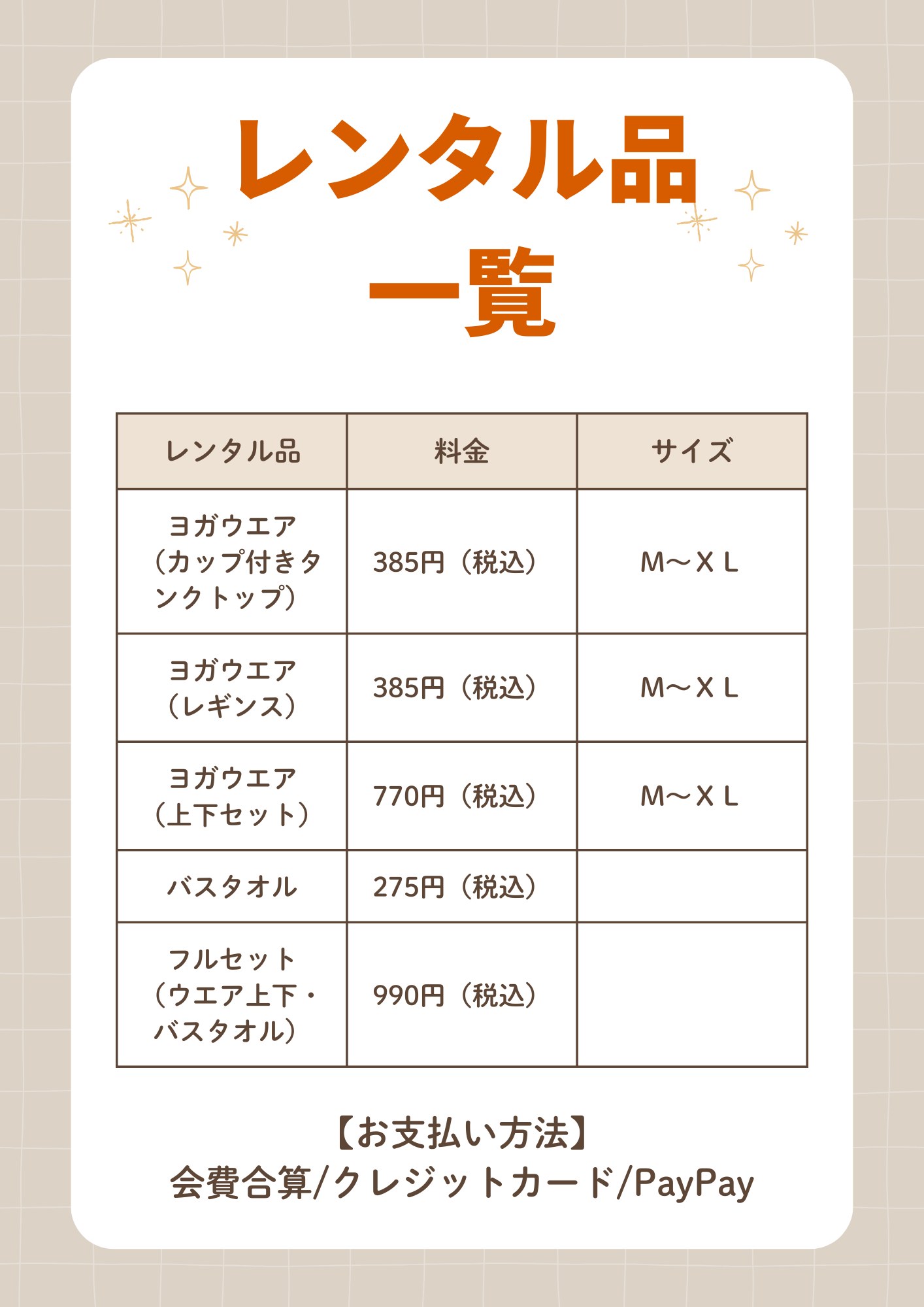 ・カップ付きタンクトップ 385円(税込) ・レギンス 385円(税込) ・上下セット 770円(税込) ・バスタオル 275円(税込) ・フルセット(ウエア上下・バスタオル) 990円(税込)