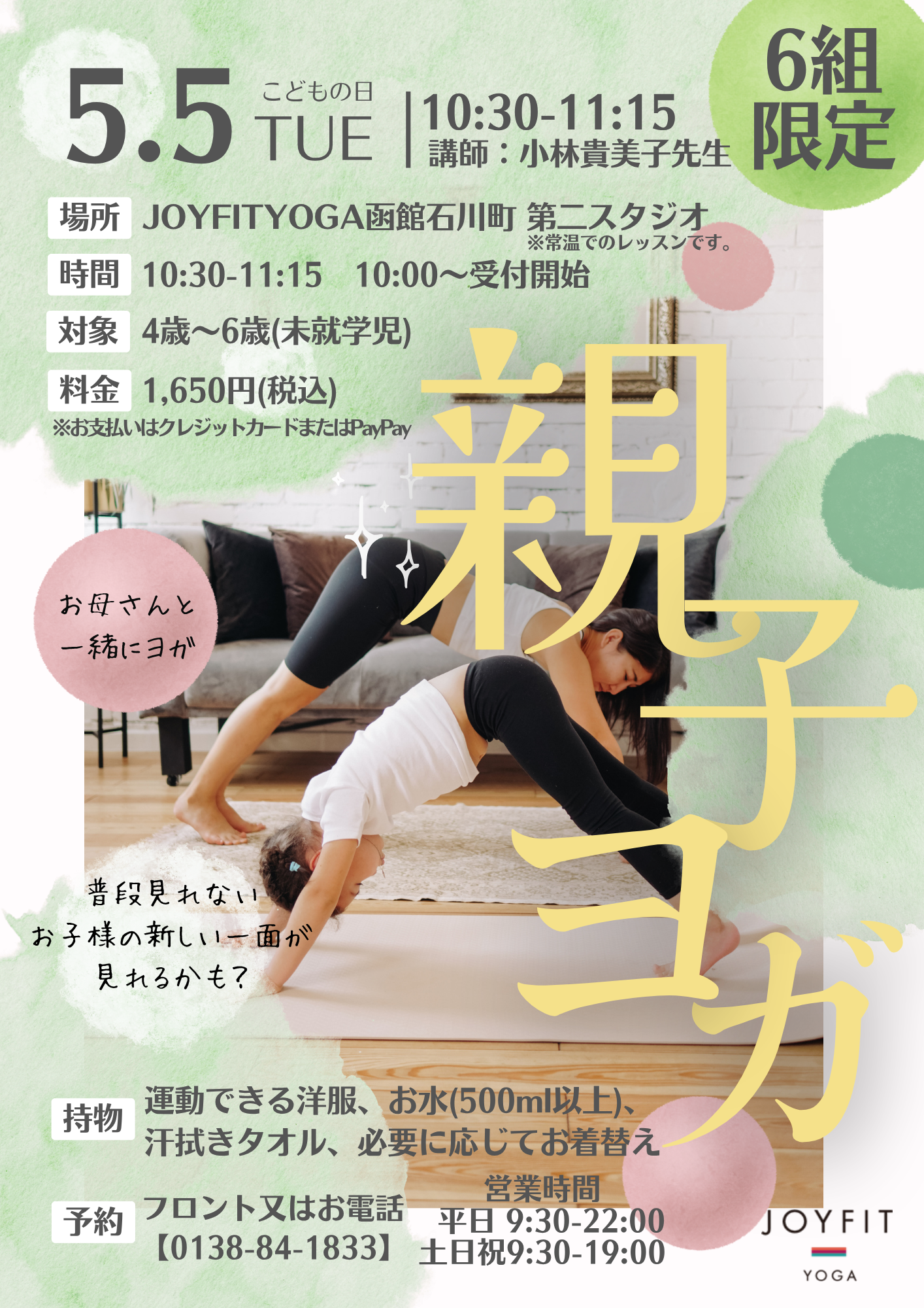 JOYFITYOGA函館石川町、第二スタジオにて 「こどもの日」イベント、親子ヨガを開催いたします^^