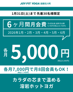 マンスリーヨガ4、マンスリーヨガ8限定 入会金 2,200円 事務手数料 3,300円 会費1月~6月の6カ月間 マンスリーヨガ4 5,500円 マンスリーヨガ8 7,700円 オプション各種2ヵ月 0円