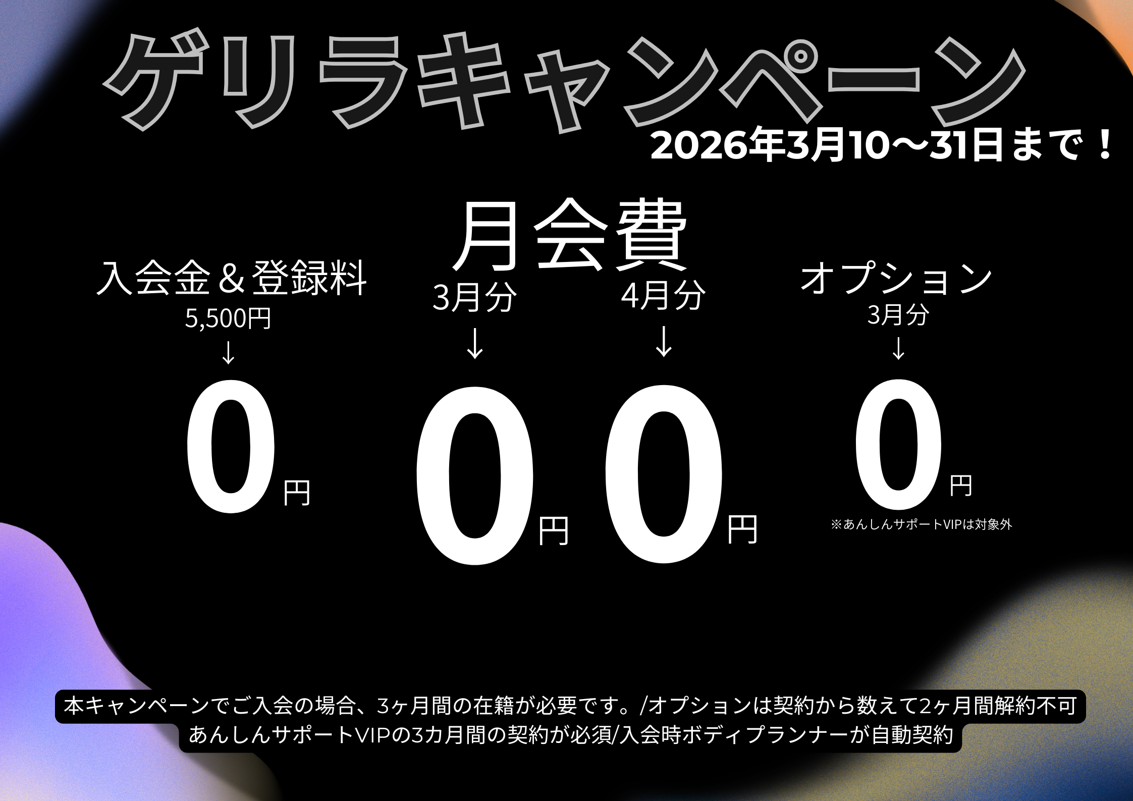 ※3ヶ月間の在籍が必要です ※あんしんサポートVIPの3ヶ月間の加入が必要です ※オプションは登録後2ヶ月間の加入が必要です ※ナショナル会員・ジムLITE会員以外の種別は本キャンペーンの適用外です