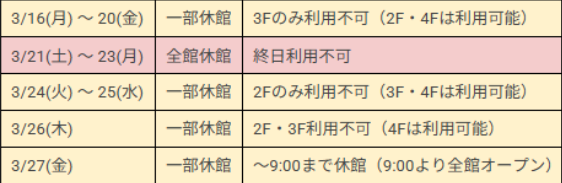 平素よりJOYFIT24ジムLITE 阪急三国駅前をご利用いただき、誠にありがとうございます。 先日ご案内いたしました館内リフレッシュ工事につきまして、施工日程が確定いたしました。当初の予定から一部変更がございますので、改めて以下の確定スケジュールをご確認ください。 皆様には度重なるご案内となり、ご不便をおかけいたしますが、何卒ご理解とご協力を賜りますようお願い申し上げます。