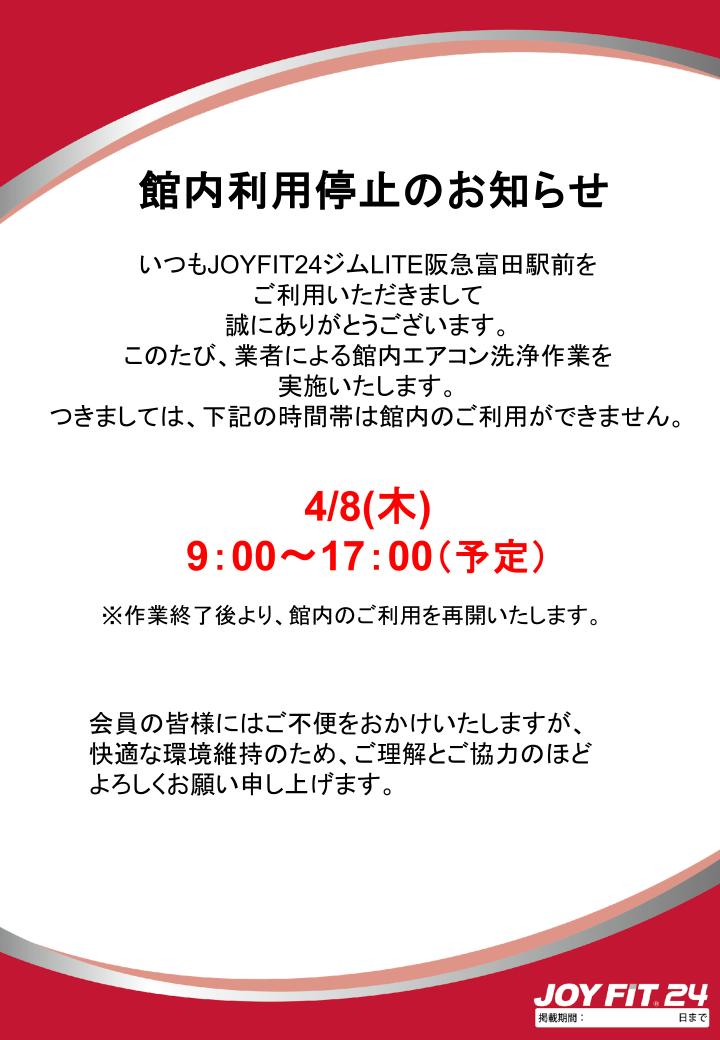 いつもJOYFIT24ジムLITE阪急富田駅前をご利用いただき、誠にありがとうございます。 下記日時において、業者によるエアコン洗浄を実施いたします。