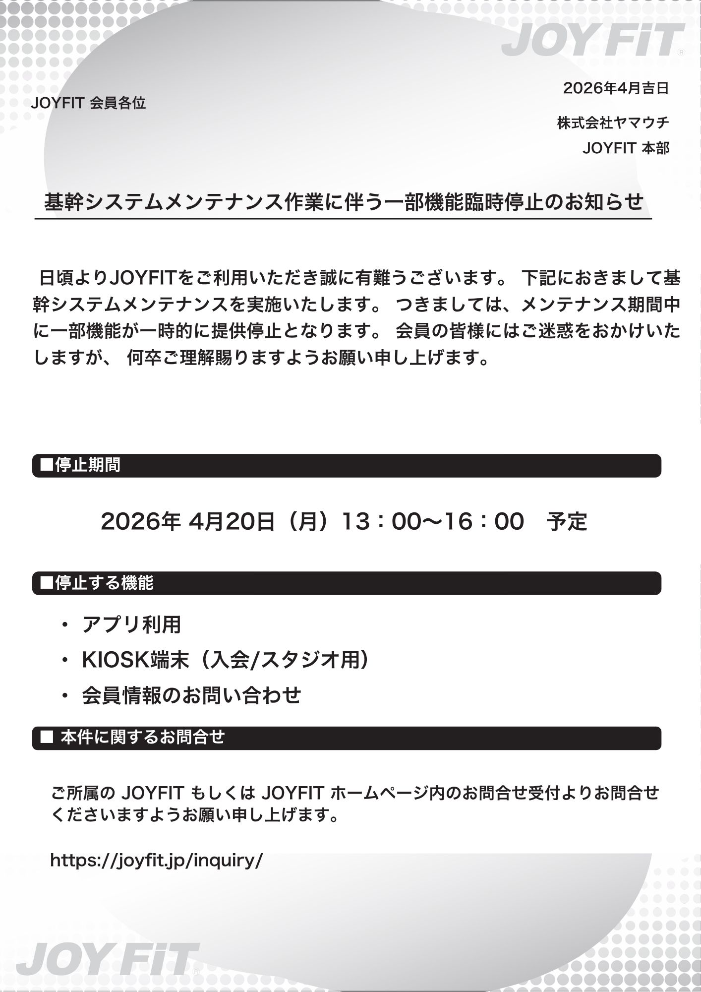 システムメンテナンスのお知らせ