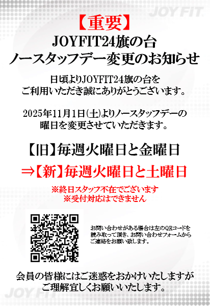 2025年11月1日(土)よりノースタッフデーの 曜日を変更させていただきます。 【旧】毎週火曜日と金曜日