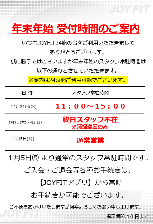 いつもJOYFIT24旗の台をご利用いただきまして ありがとうございます。 誠に勝手ではございますが年末年始のスタッフ常駐時間は 以下の通りとさせていただきます。 ※館内は24時間ご利用可能でございます。