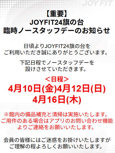 日頃よりJOYFIT24旗の台をご利用いただき誠にありがとうございます。