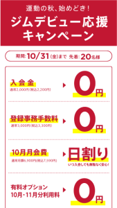 ・初期費用5,500円⇒0円 ・10月会費⇒日割り料金 ・10月・11月有料オプション利用料⇒0円 ・該当者はさらにお得! 他クラブからののりかえorペア割or再入会で12月会費⇒半額