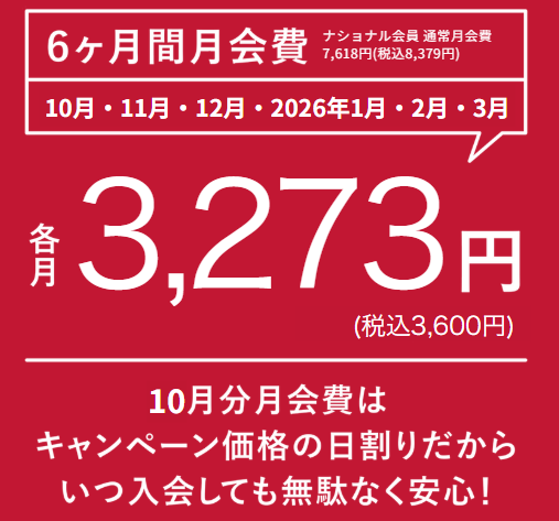 ・10月から2026年3月 月会費(税込8,379円)➔ 3,273円 (税込3,600円)!! ・各種オプション 初月 ➔ 0円!!