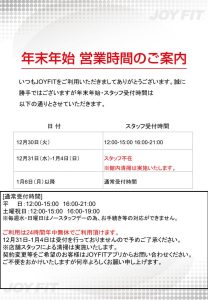 年末年始スタッフ受付時間変更のお知らせ