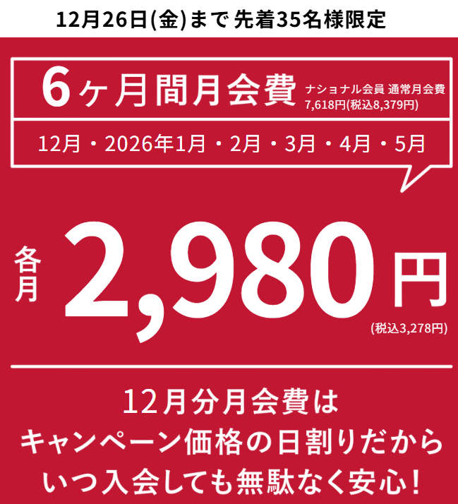 12月~5月の6か月間、各月の会費税込3,278円!!