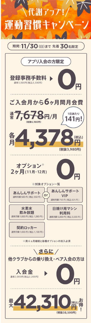 ・各種オプション10・11月分会費=0円(水素水/あんしんサポートorあんしんサポートVIP/タンニング/契約ロッカー)