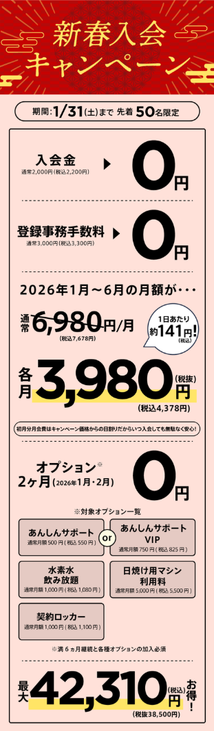 ・各種オプション1・2月分会費=0円(水素水/あんしんサポートorあんしんサポートVIP/タンニング/契約ロッカー)