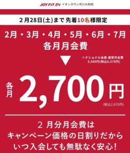 | 営業時間 | 24時間営業 全時間安心セキュリティ完備! ご入会は、『JOYFITアプリ』よりお願いいたします。 ※クレジットカード入会専用 口座引き落としをご希望の方は近隣の JOYFIT24イオンタウン新船橋でご入会いただけます。 JOYFIT24イオンタウン新船橋でご入会の場合でもJOYFIT24イオンタウン市川大和田はご利用いただけます。 |