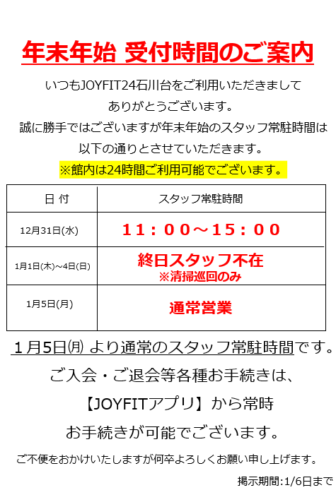 いつもJOYFIT24石川台をご利用いただきまして ありがとうございます。 誠に勝手ではございますが年末年始のスタッフ常駐時間は 以下の通りとさせていただきます。 ※館内は24時間ご利用可能でございます。