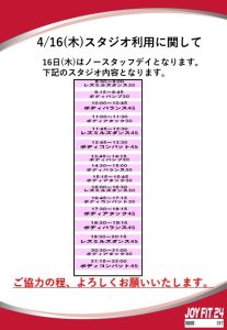 4/16(木)ノースタッフデイのスタジオ内容変更に関して