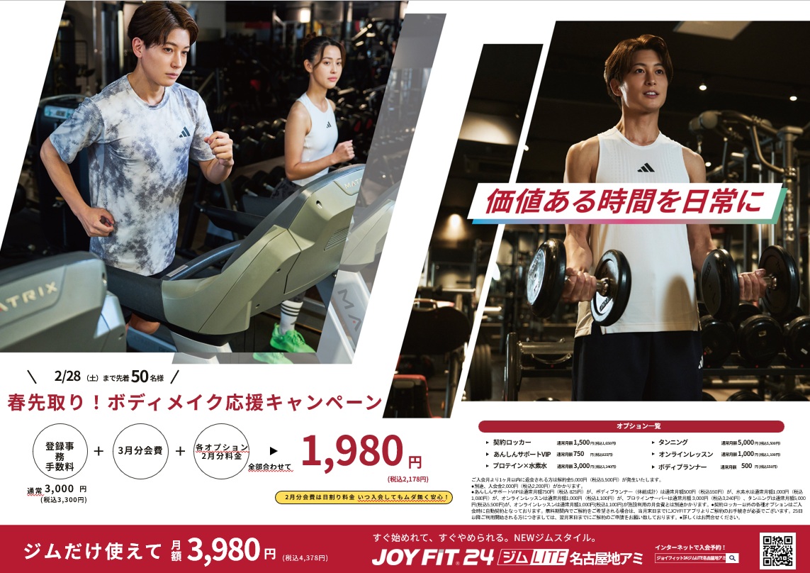 | その他 | ■24時間営業のスポーツクラブです。 ■JOYFIT24名古屋地アミは完全無人営業です。 ご不明な点等がございましたら、JOYFITアプリよりお問い合わせ下さいませ。 ■貴重品につきましてはご自身で管理をお願いします。 ■シャンプー・リンス・ボディーソープ・タオルの貸し出しはございませんので、 各自でご用意をお願いいたします。 ※ドライヤーは貸し出しておりますので、ご自由にご利用頂けます。 |