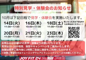 営業時間 | ■館内24時間営業!! <入会受付時間> JOYFITアプリから24時間入会可能です。 ※クレジット決済のみ ■毎週月曜・火曜・木曜日 10:00、12:00、14:00、16:00開始で見学・体験会開催中!! ※ 火曜日は12:00開始となります ■スタッフ不在の完全無人店舗でございます。 |