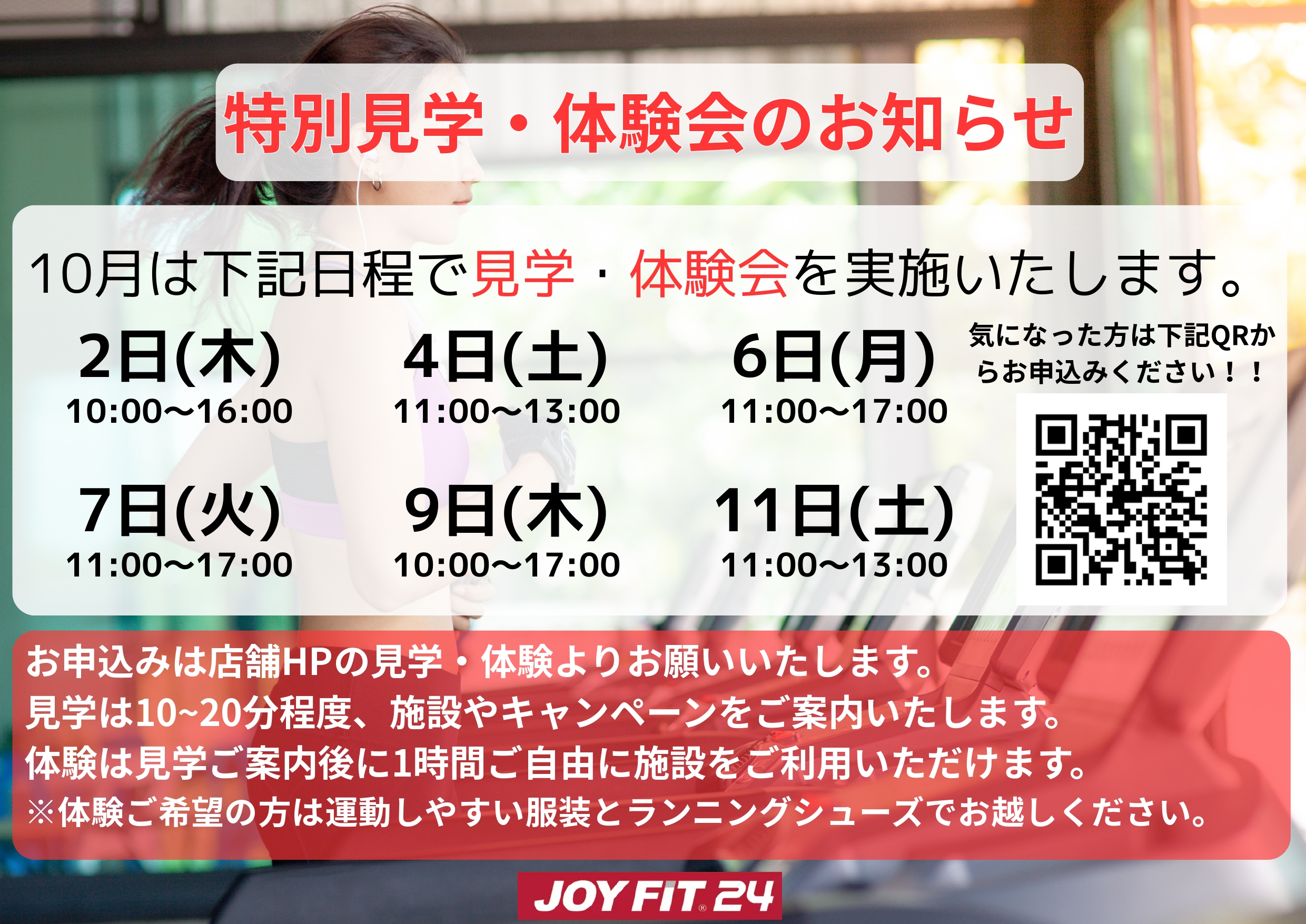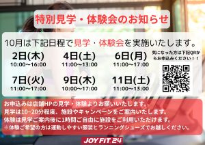営業時間 | ■館内24時間営業!! <入会受付時間> JOYFITアプリから24時間入会可能です。 ※クレジット決済のみ ■毎週月曜・火曜・木曜日 10:00、12:00、14:00、16:00開始で見学・体験会開催中!! ※ 火曜日は12:00開始となります ■スタッフ不在の完全無人店舗でございます。 |
