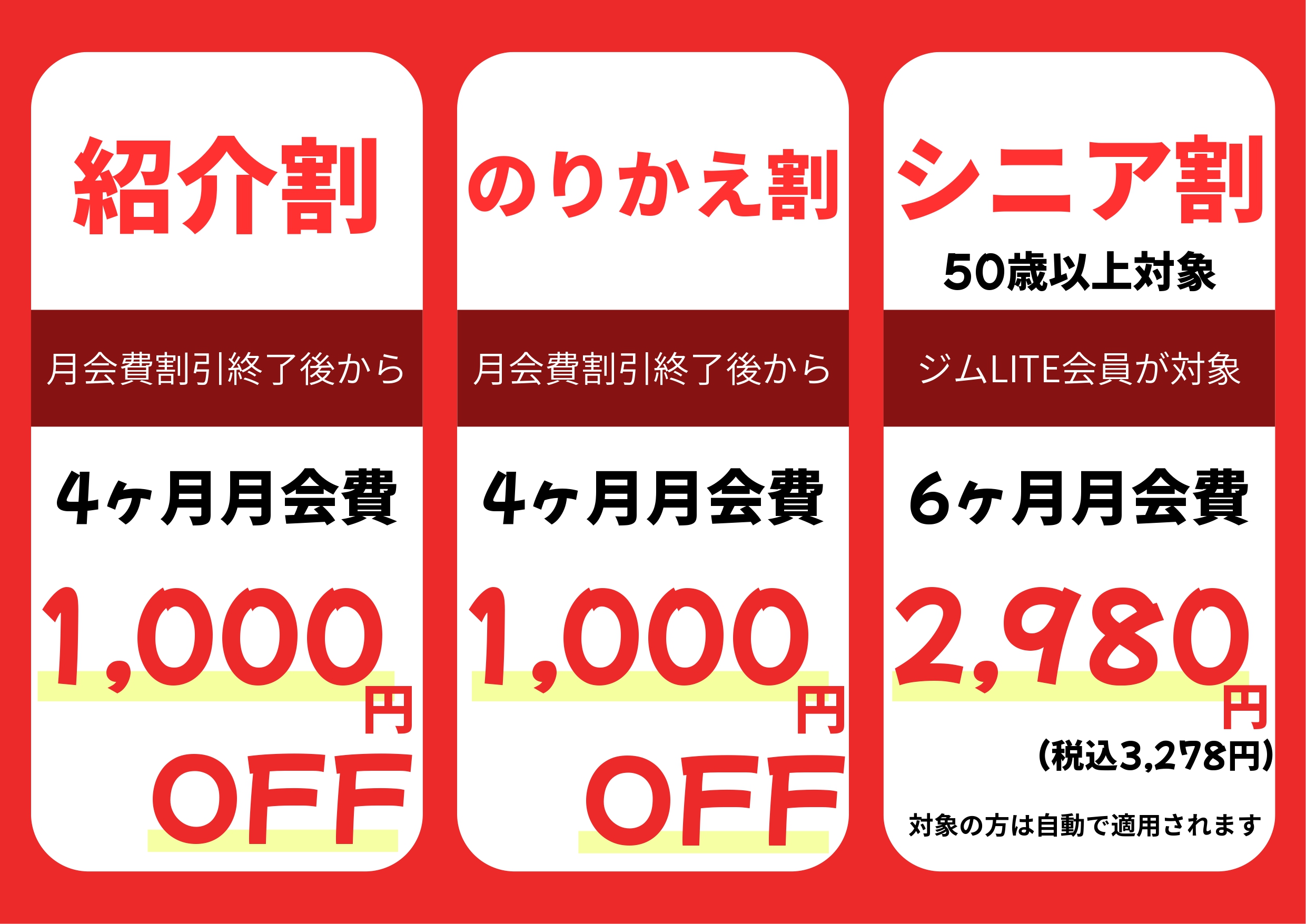 ※他ジム在籍証明をご準備いただき、店内掲示板にございます【「のりかえ割」・「紹介割」のご申請手続きについて】からQRコードを読み取り、ご申請をお願いいたします。