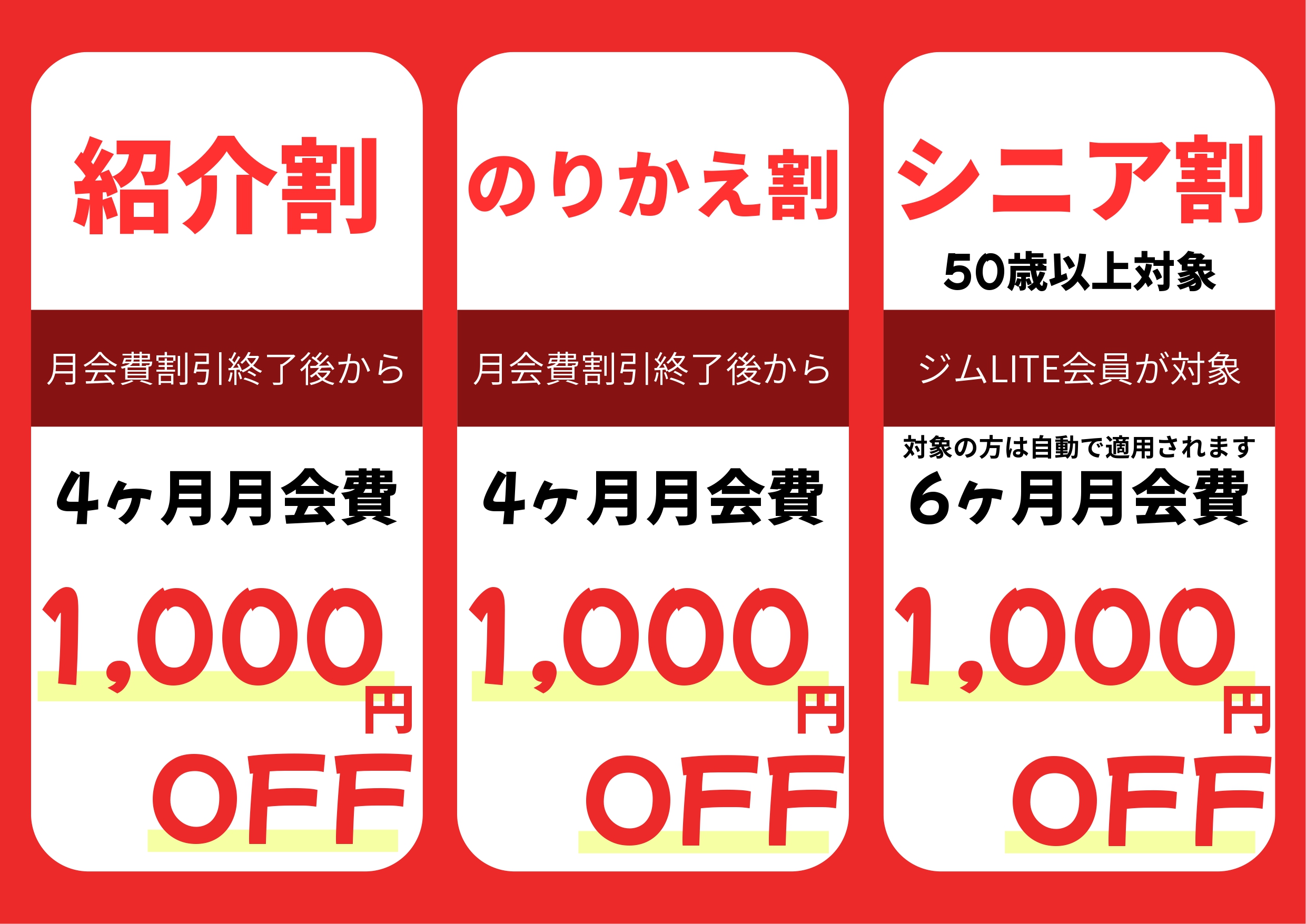 ※他ジム在籍証明をご準備いただき、店内掲示板にございます【「のりかえ割」・「紹介割」のご申請手続きについて】からQRコードを読み取り、ご申請をお願いいたします。