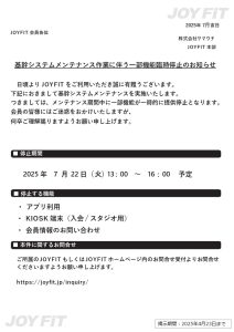 | 営業時間 | 24時間年中無休 スタッフ不在の無人化店舗でございます。 ご入会は、『JOYFITアプリ』から手続き可能です。 アプリのダウンロードをお願い致します。 ※クレジットカード入会専用 |