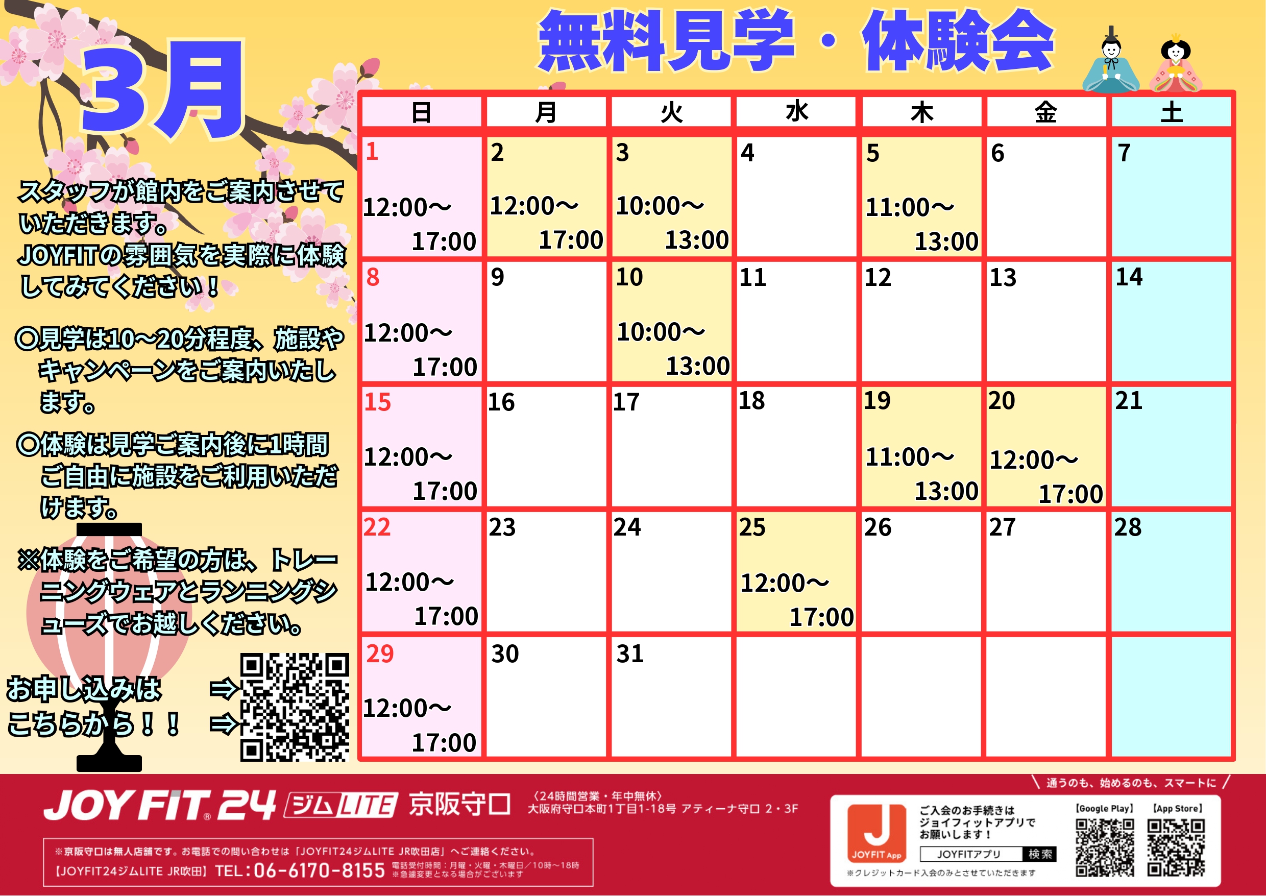 | 電話 | 06-6170-8155(JOYFIT24ジムLITE JR吹田にて受け付けます) ---受付時間--- 月曜・火曜・木曜日 10:00-18:00 |