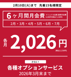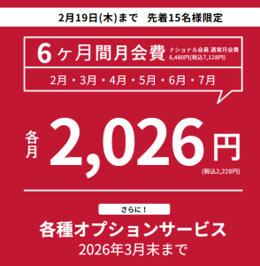 2月から7月までの6ヶ月間会費⇒各月税込2,228円!