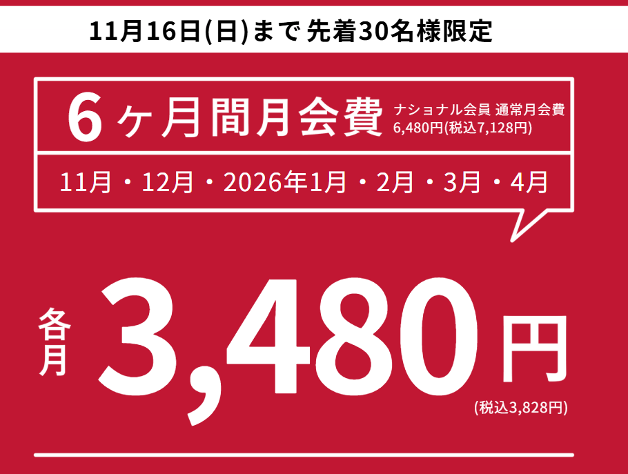 11月から4月までの6ヶ月間会費⇒各月税込3,828円!