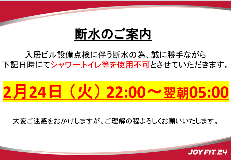 【2月24日 22:00~】断水のお知らせ