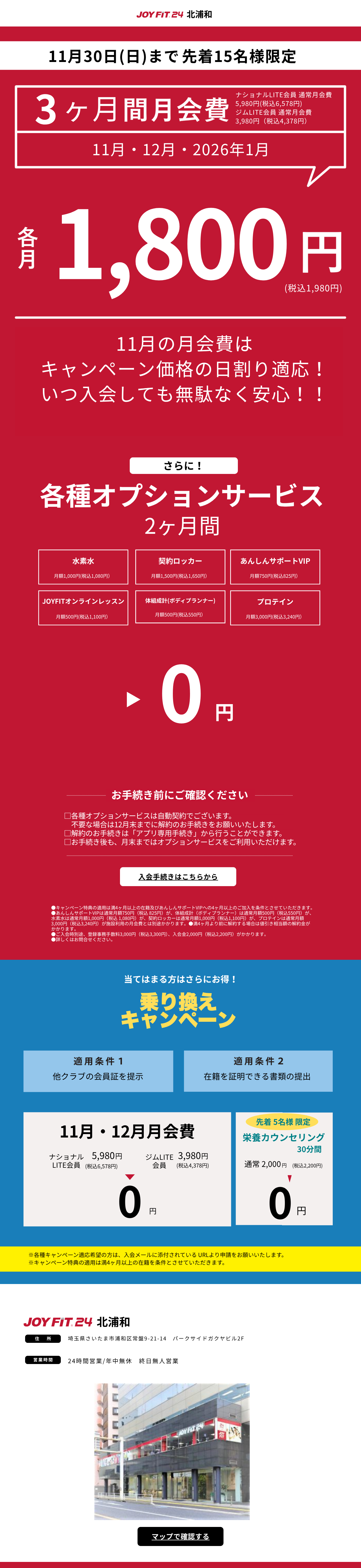| その他 | ■24時間営業のスポーツクラブです。 ■JOYFIT24北浦和に関しては完全無人店舗となっており、スタッフが常駐しておりません。 ご了承下さい。(館内清掃の為、在中している時間もございますが店舗での受付は行なっておりません。) ■貴重品につきましてはご自身で管理をお願いします。 ■シャンプー・リンス・ボディーソープ・タオルの貸し出しはございませんので、 各自でご用意をお願いいたします。 ※ドライヤーは貸し出しておりますので、ご自由にお使いください。 ☆入会を悩まれている方はこちらをタップ☆ ![]() |