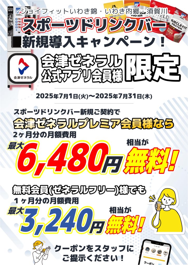 この度、JOYFITいわき錦、いわき内郷、須賀川にてドリンク&プロテインサーバーの導入を記念して、会津ゼネラルプレミア会員様限定クーポン配信中!