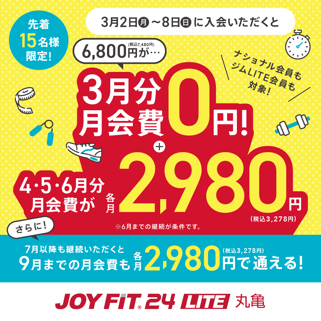 この1週間内で入会すると、、、 ナショナル会員もジムLITE会員も ・3月会費 :0円 ・4月~6月会費:2,980円(税抜) で利用可能!!