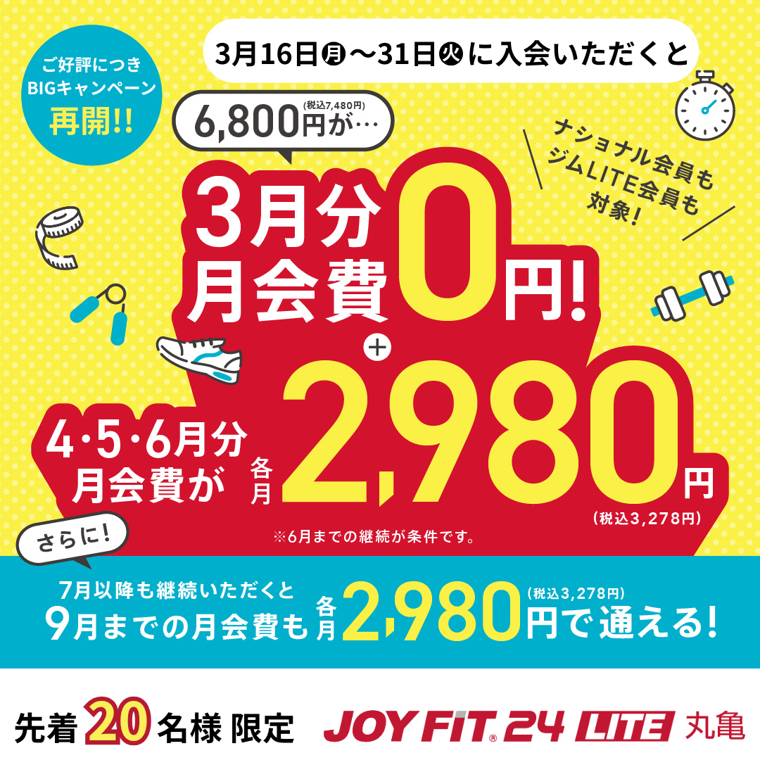 この期間内に入会すると、、、 ナショナル会員もジムLITE会員も ・3月会費 :0円 ・4月~6月会費:2,980円(税抜) で利用可能!!