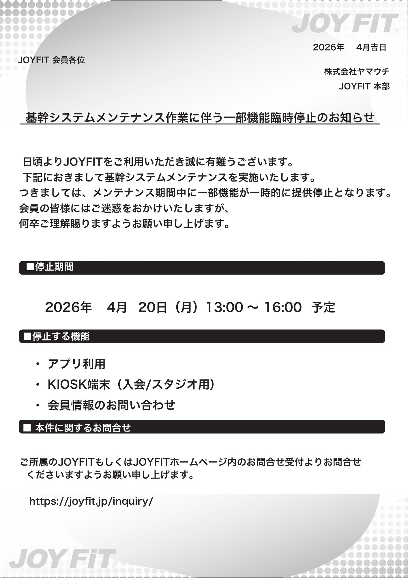 基幹メンテナンスのお知らせ
