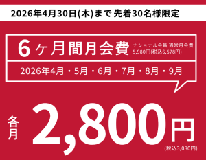 ・6ヶ月間月会費(通常月額5,980円)が、各月2,800円!(税込3,080円)